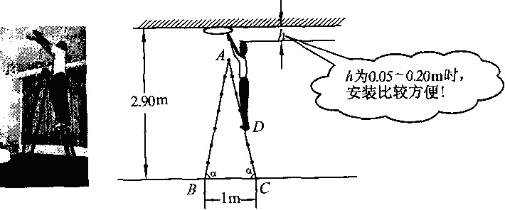 20.(9分)如图所示,电工李师傅借助梯子安装天花板上距地面2 .90m的顶灯.已知梯子由两个相同的矩形面组成,每个矩形面的长都被六条踏板七等分,使用时梯脚的固定跨度为1m.矩形面与地面所成的角α为78°.李师傅的身高为l.78m,当他攀升到头顶距天花板0.05~0.20m时,安装起来比较方便.他现在竖直站立在梯子的第三级踏板上,请你通过计算判断他安装是否比较方便?   (参考数据:sin78°≈0.98,cos78°≈0.21,tan78°≈4.70.)