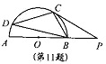 11.如图,AB为半圆O的直径,延长AB到点P,使BP= AB,PC切半圆O于点C,点D是弧AC上和点C不重合的一点,则∠D的度数为                             .